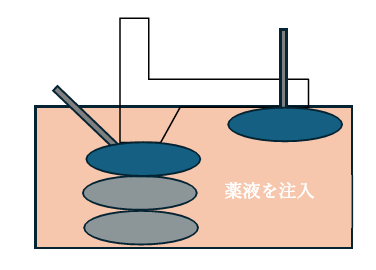 基礎外周部や内側から地盤中に薬液を注入し、注入圧力(薬液が上に押し上げる力)